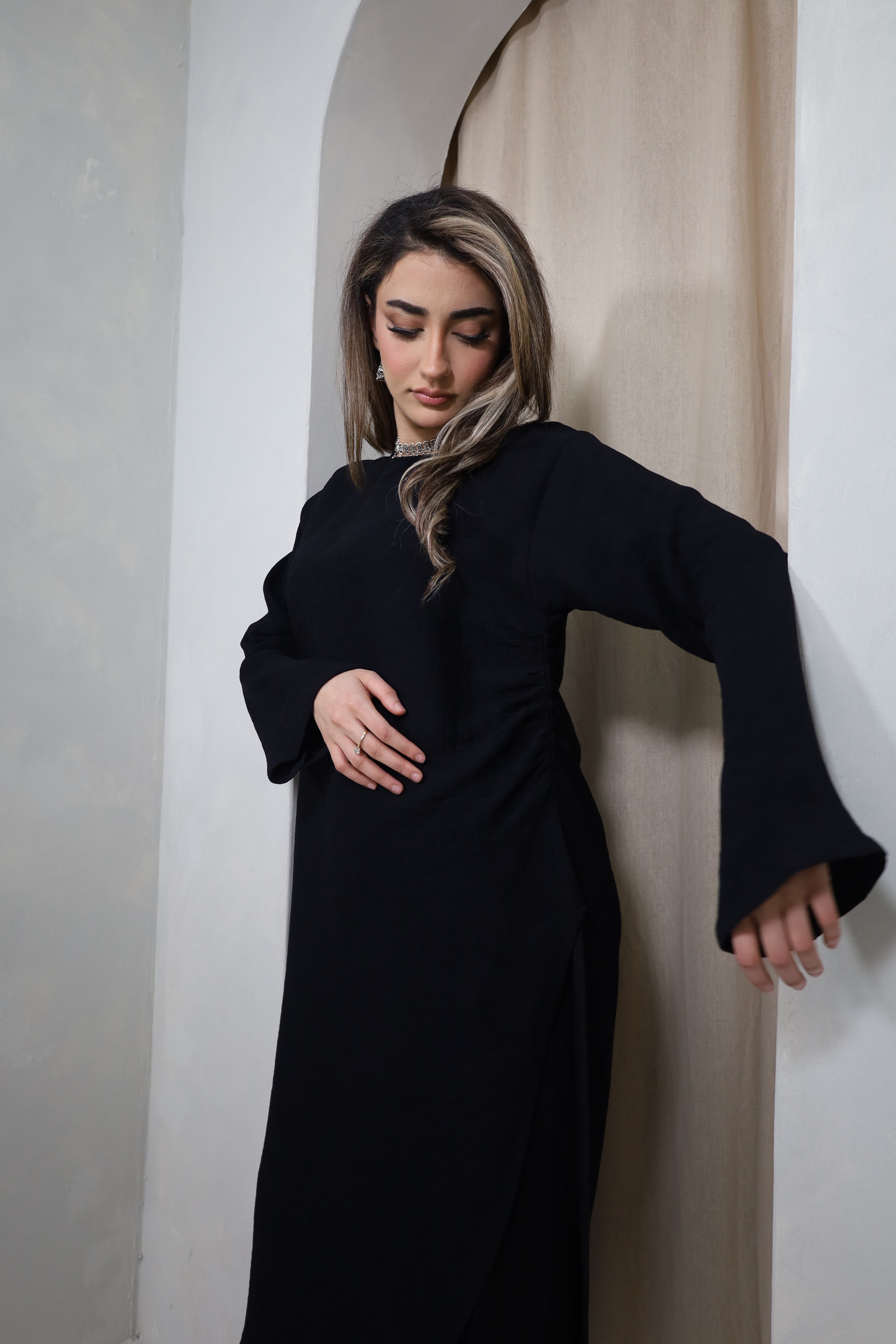 Refined and effortlessly modern, this black co-ord set is crafted from coco pleated jersey, offering a soft drape with a structured yet fluid finish. The fabric provides comfort without compromising on elegance. The minimalist silhouette is elevated by subtle pleating, making it a versatile choice for both elevated daywear and evening styling.